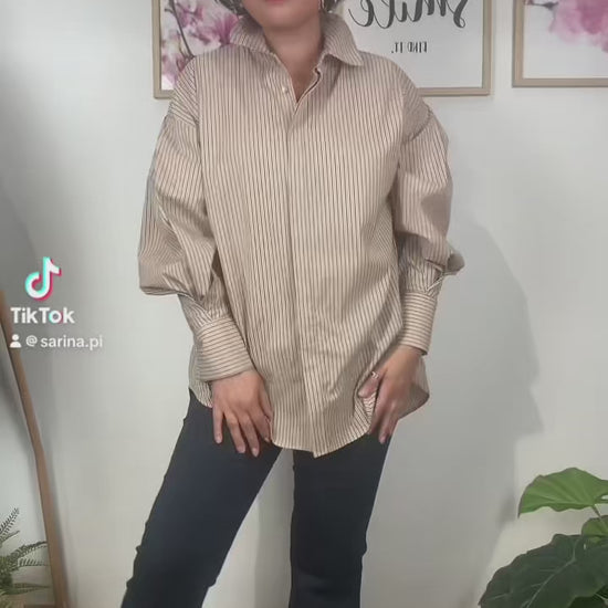 Camicia in misto cotone beige a righine blu.
