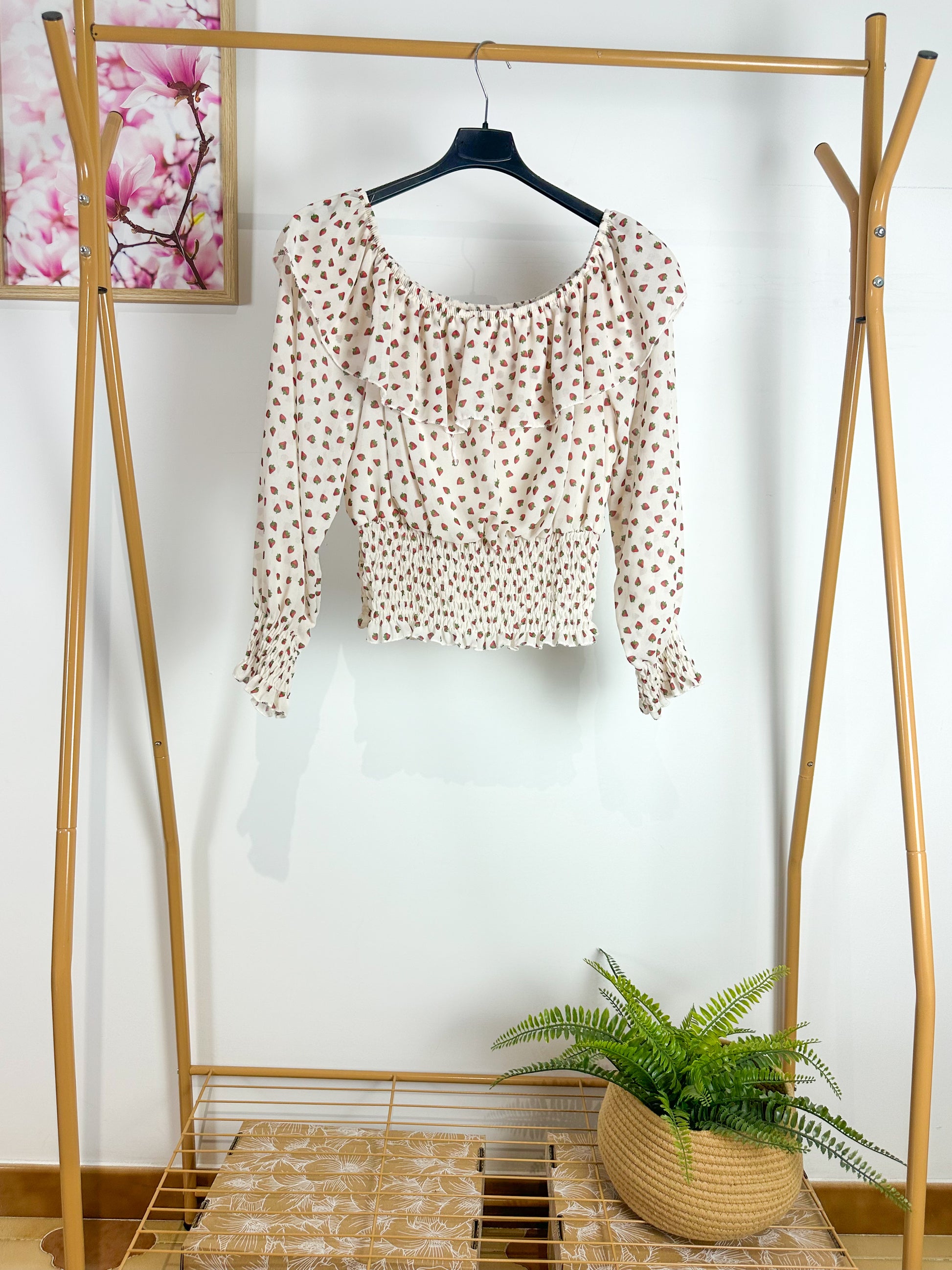 Le maniche lunghe terminano con un polsino elastico arricciato, richiamando il motivo della vita e permettendo di regolare la lunghezza (puoi tirarle su per un effetto ancora più "puff").