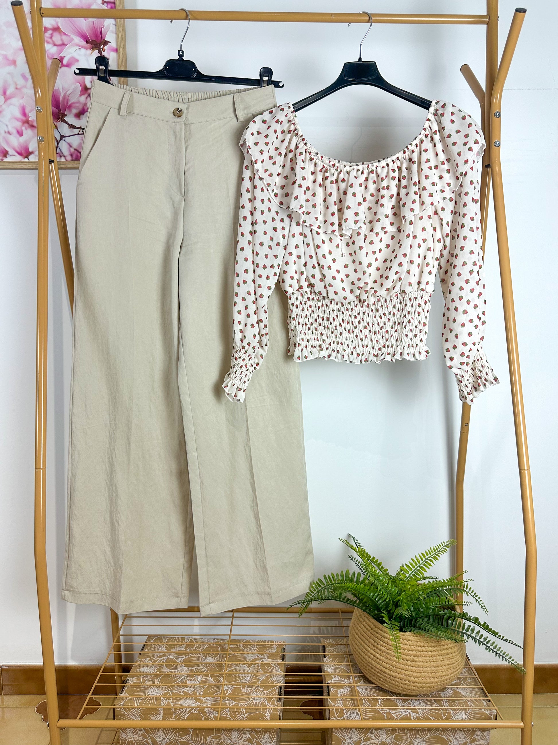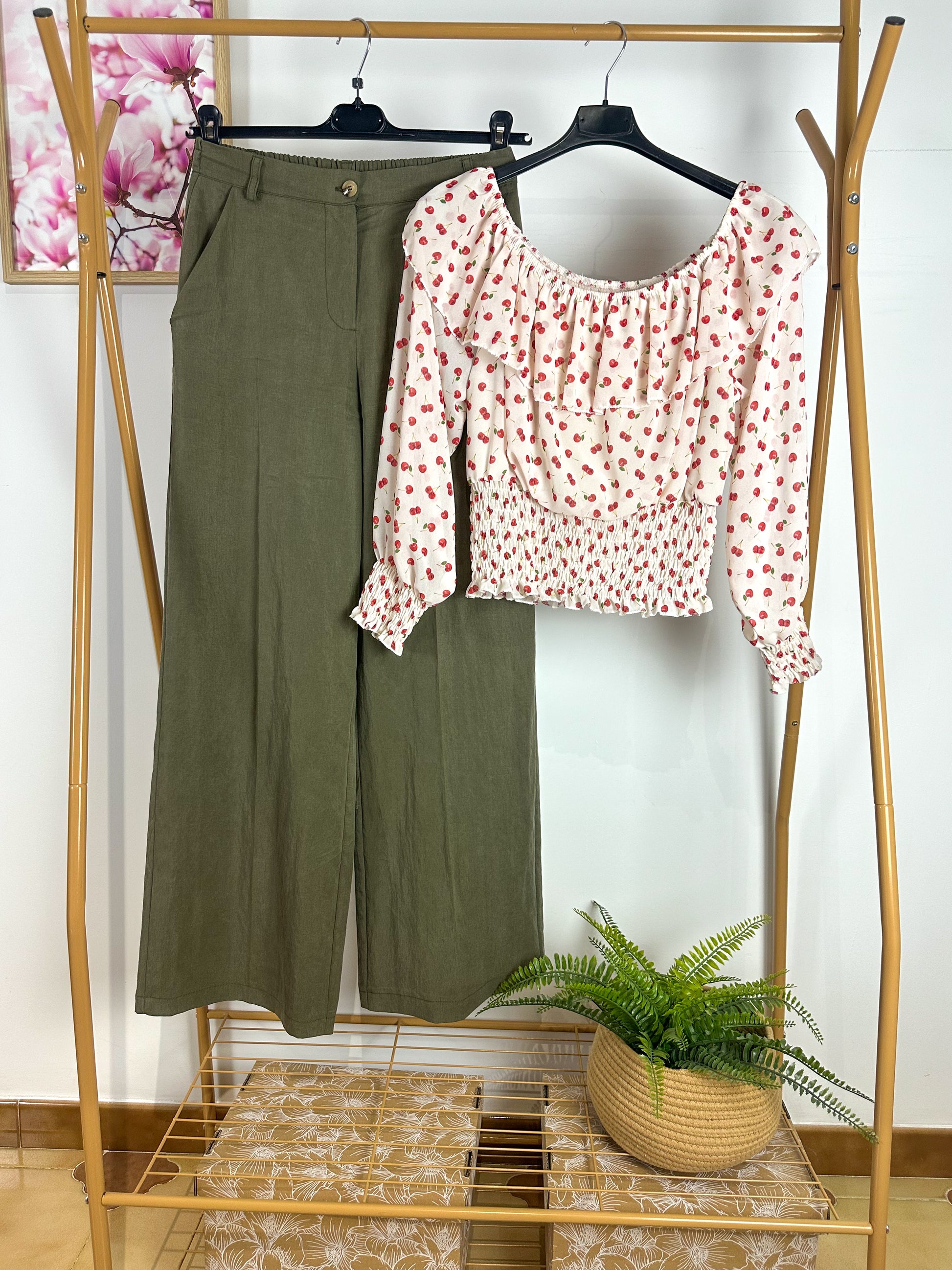 • Look Sofisticato: Con i pantaloni a palazzo in tela verdi o sabbia, per un completo fluido e traspirante, ideale per l'ufficio o un pranzo fuori.