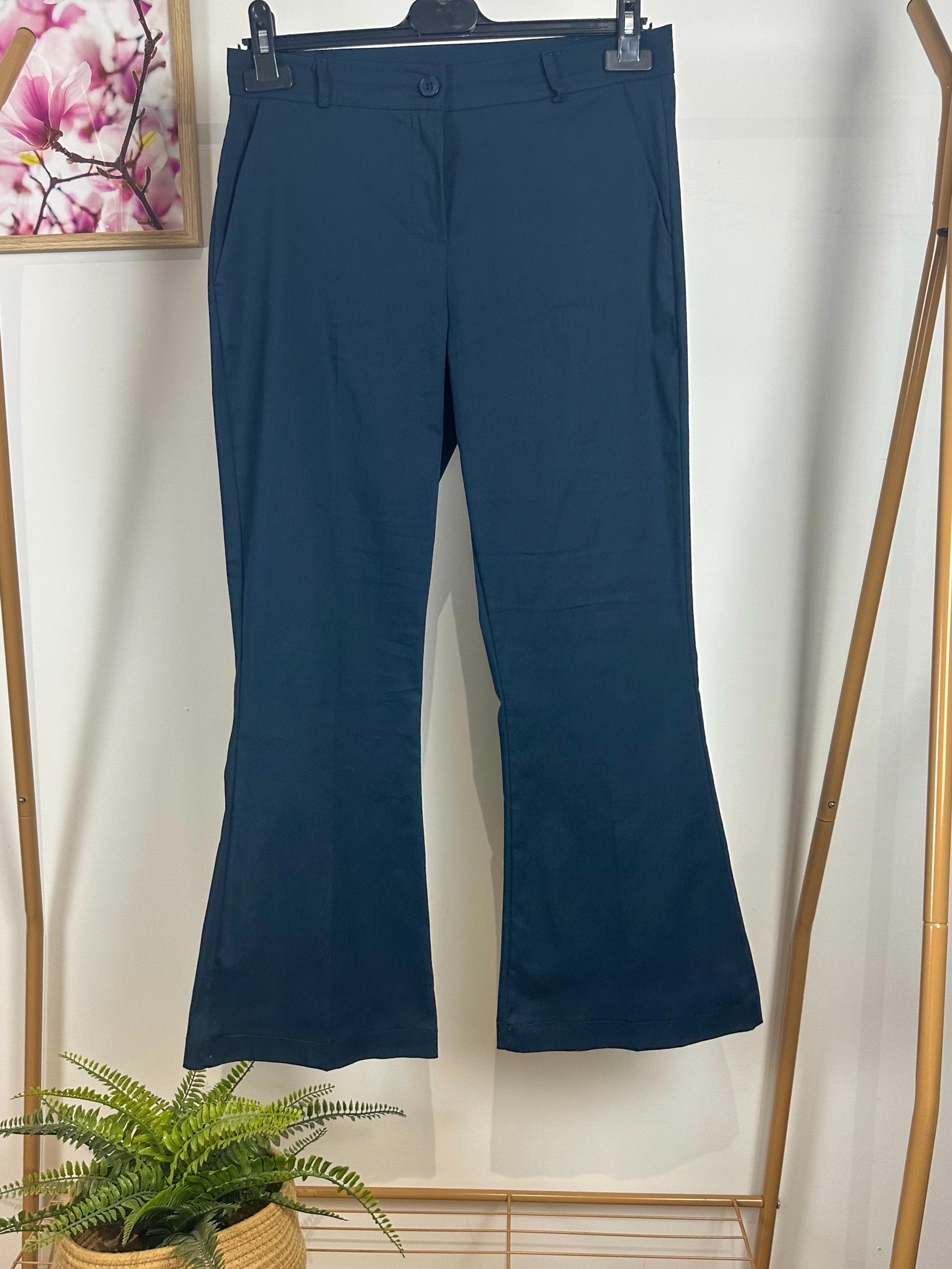 Pantaloni in misto cotone blu, svasatura a campanella, modello crop alla caviglia.